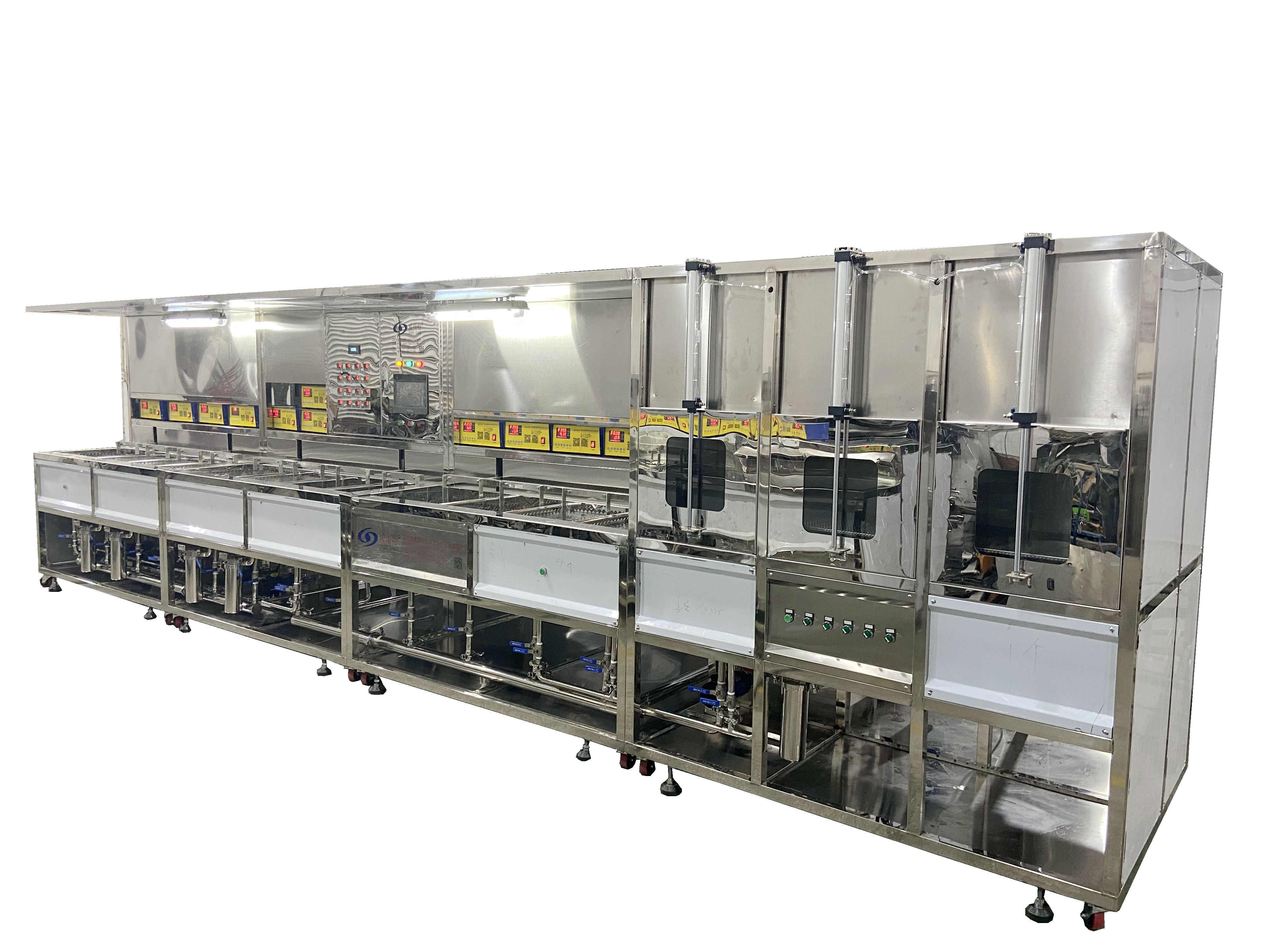 威固特VGT-1509FH為前處理光學(xué)超聲波清洗機(jī),設(shè)備共有15個(gè)功能槽,配置有拋動(dòng)系統(tǒng)、循環(huán)過濾系統(tǒng)、自動(dòng)恒溫系統(tǒng)、超聲波清洗系統(tǒng)、定時(shí)系統(tǒng)、框架系統(tǒng)、CO2滅火系統(tǒng)等。設(shè)備采用環(huán)保型水溶劑洗滌、純水漂洗,為環(huán)保型清洗系統(tǒng)。配電箱用全不銹鋼結(jié)構(gòu)。